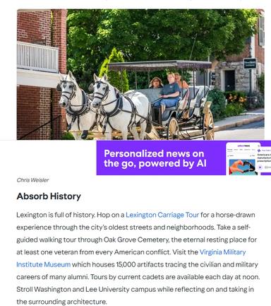 "3 Perfect Days in Lexington Virginia" https://www.ace.aaa.com/publications/travel/us-destinations/virginia/lexington.html